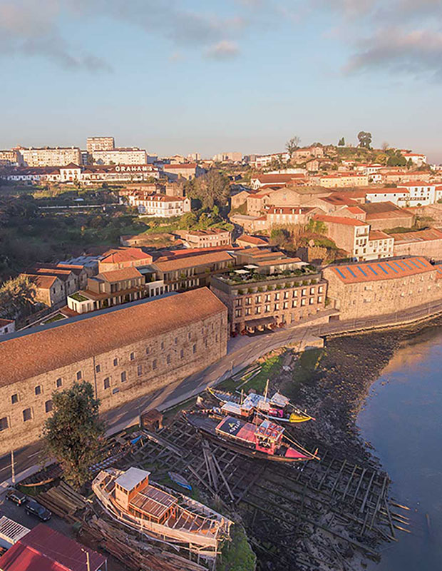 The Rebello Hotel, situated on the banks of the river Douro in Gaia, opened in summer 2023. It is the result of a consolidation and conversion of several huge warehouse buildings which owe their roots to their original use as port wine warehouses.